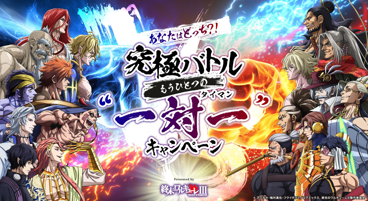 「あなたはどっち?!究極バトルもうひとつの”一対一<タイマン>”キャンペーン」と題し、神VS人類 最終闘争<ラグナロク>の第1~6回戦の対戦カードごとに、些細だけどこだわりたい究極の2択の投票を実施!