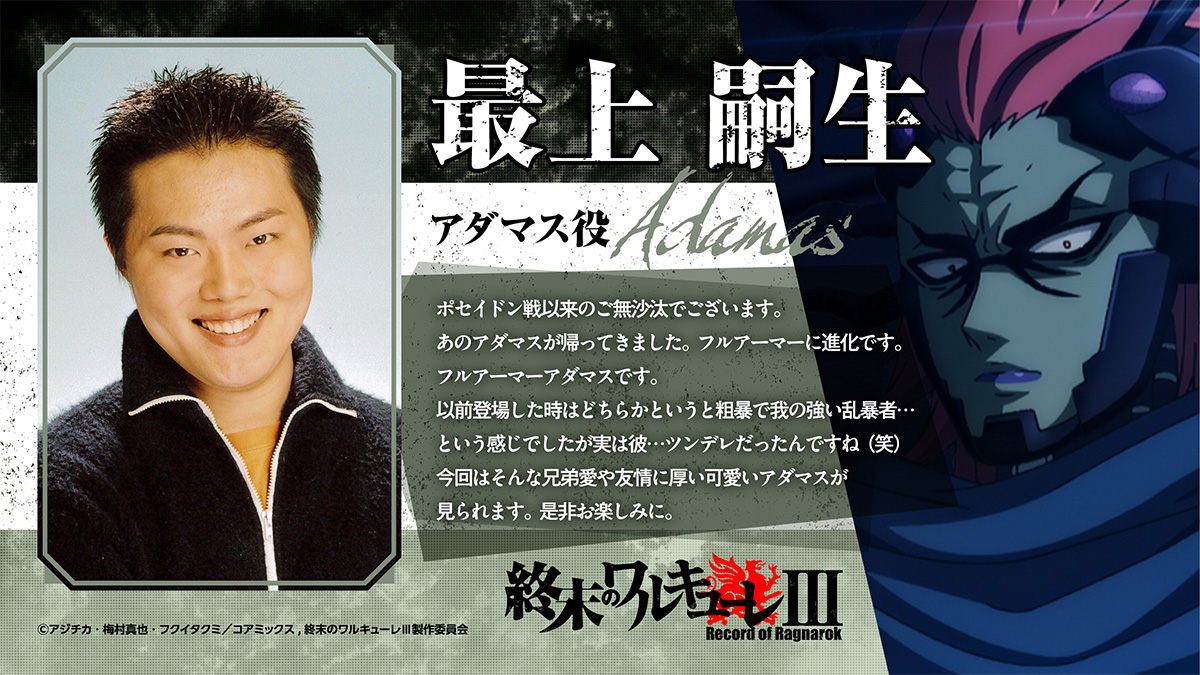 全てがパワーアップしてお届けする、世界で大注目の作品『終末のワルキューレⅢ』!!本日よりNetflixにて配信開始!!神と人類の代表が一対一で闘う神VS人類最終闘争〈ラグナロク〉。人類側が第6回戦を制したことで、神と人類は3勝3敗……再びの五分に……。第7回戦、静かに声をあげたのは、弟であるポセイドンの仇討ちに燃える、“冥界の王”ハデス。一方、人類側の出場者は“始まりの王”始皇帝。王と王の頂上決戦が開幕です!!!!!