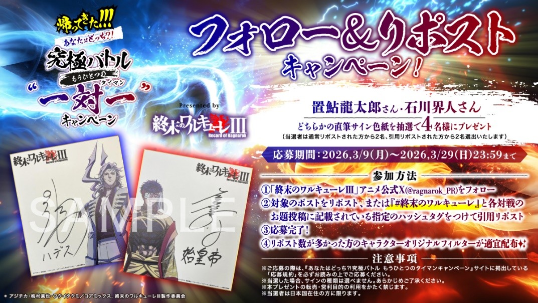 ①および②の両方が必要です。どちらか一つだけでは応募したことになりません。- アニメ『終末のワルキューレⅢ』(以下「本作品」といいます)の公式Xアカウント(@ragnarok_PR)をフォローしてください。